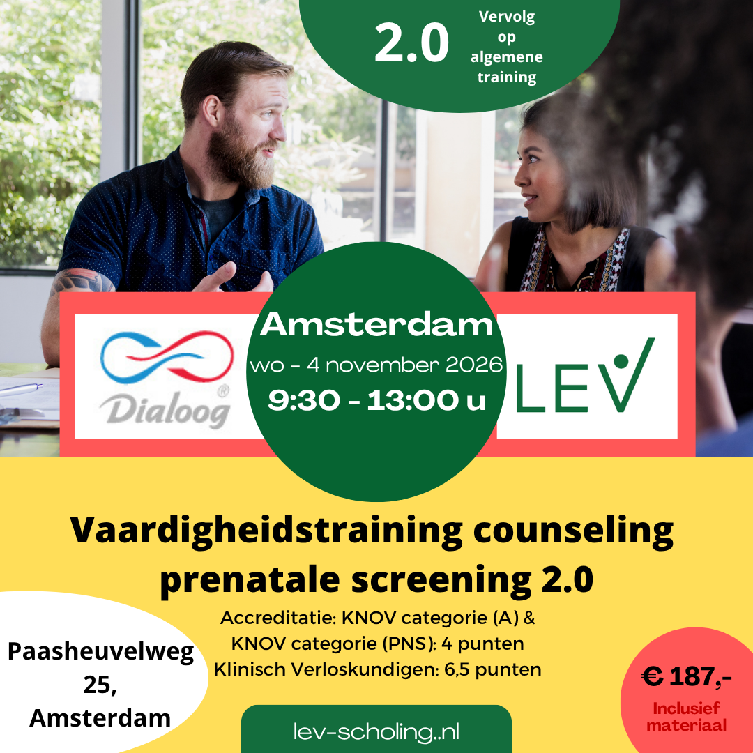 Amsterdam – Paasheuvelweg 25, zaal GAMMA, woensdag 4 november 2026 09:30u-13:00u | Vaardigheidstraining Counseling Prenatale Screening 2.0
